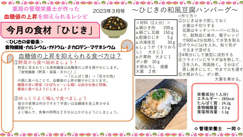 今月のレシピはひじきを使用した豆腐ハンバーグです。