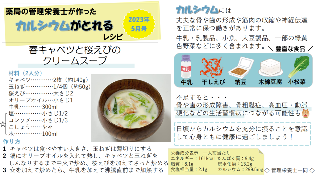 今月のレシピはカルシウムがとれる春キャベツと桜えびのクリームスープです。