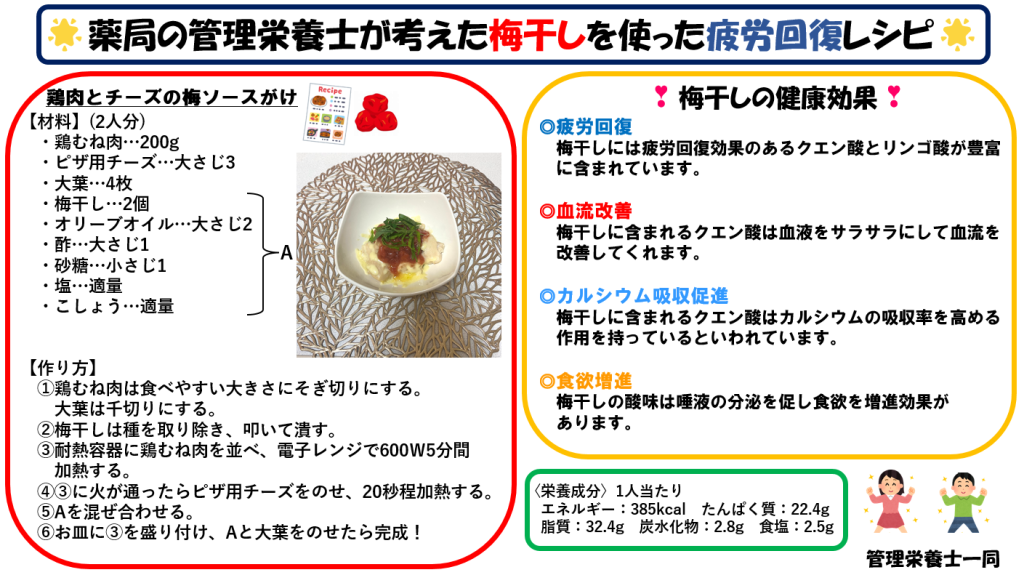 今月のレシピは疲労回復効果のある梅干しを使った鶏肉とチーズの梅ソースがけです。