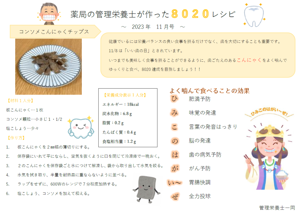 そのため、今月はいい歯の土台となる顎を丈夫にするためのこんにゃくチップスをご紹介します。