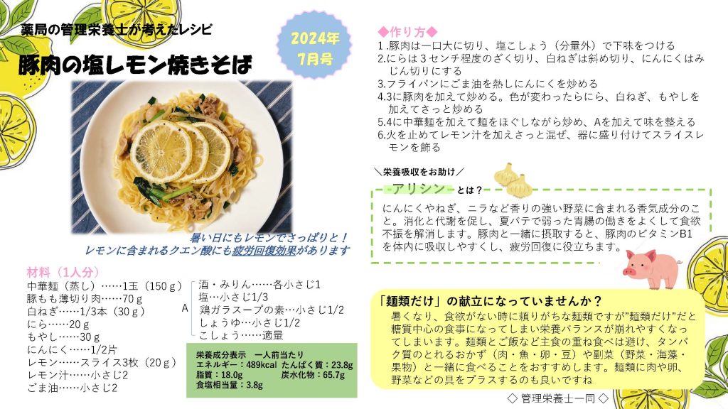 管理栄養士のおすすめレシピ♪豚肉の塩レモン焼きそば🍋