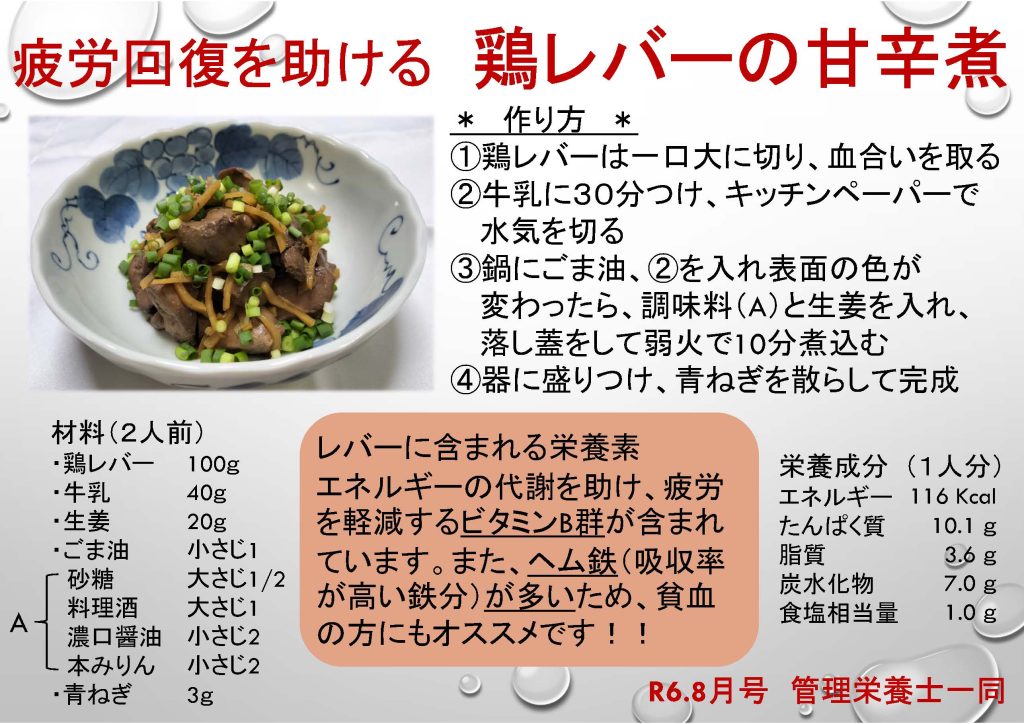 さて、今月の月中レシピは疲労の回復を助けてくれる「鶏レバーの甘辛煮」です。