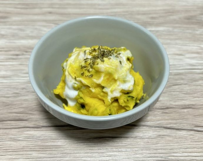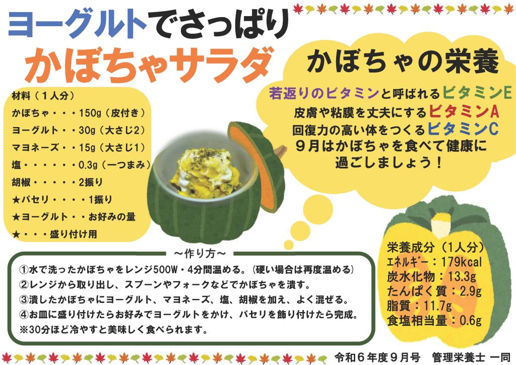 今月のレシピは「ヨーグルトでさっぱり かぼちゃサラダ」です。