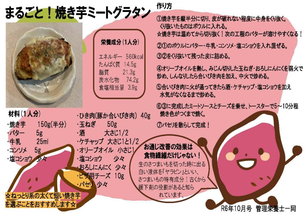 10月後半のレシピは、秋の味覚であるさつまいもを皮ごと頂ける&市販の焼き芋で作れる「まるごと!焼きいもグラタン」です。さつまいもはご自身で蒸したものでも◎
