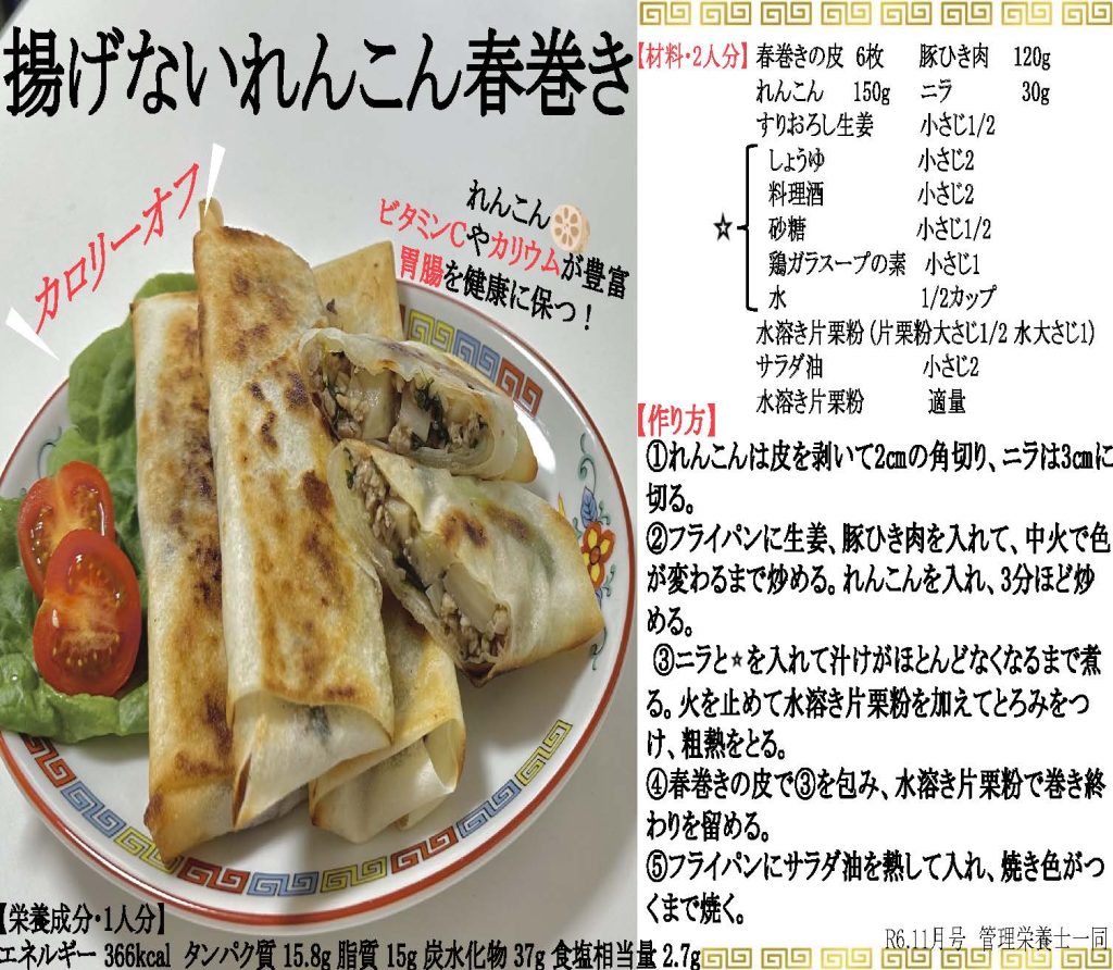 11月前半のレシピは「揚げないれんこん春巻き」です。