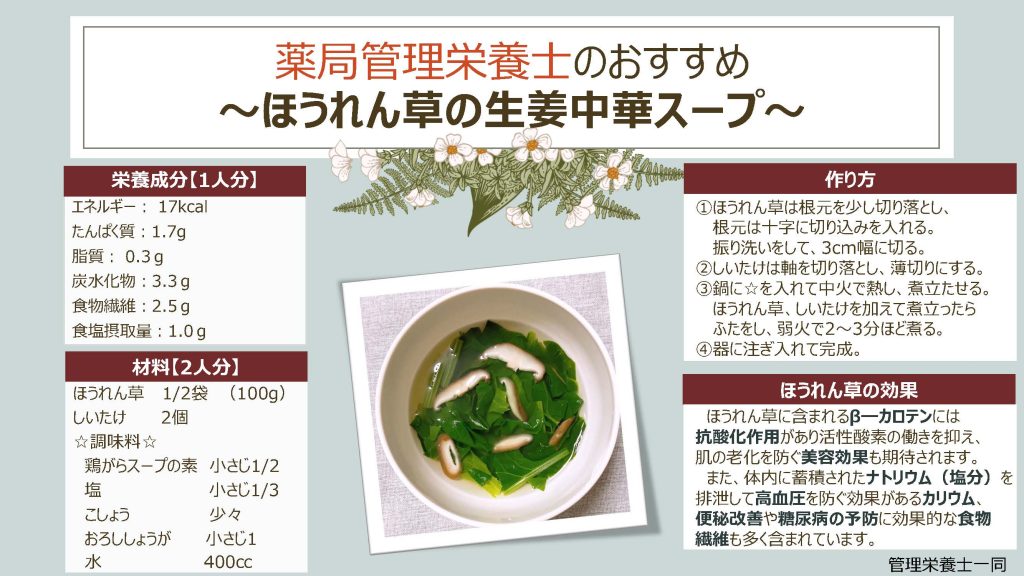 さて、今回はほうれん草の生姜中華スープです。ほうれん草にはβ―カロテンによる美容効果や、便秘改善・糖尿病の予防に効果的な食物繊維も多く含まれています。