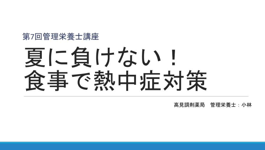 講座のテーマは「 夏に負けない!食事で熱中症対策 」で、当日は3名の方にご参加いただきました。