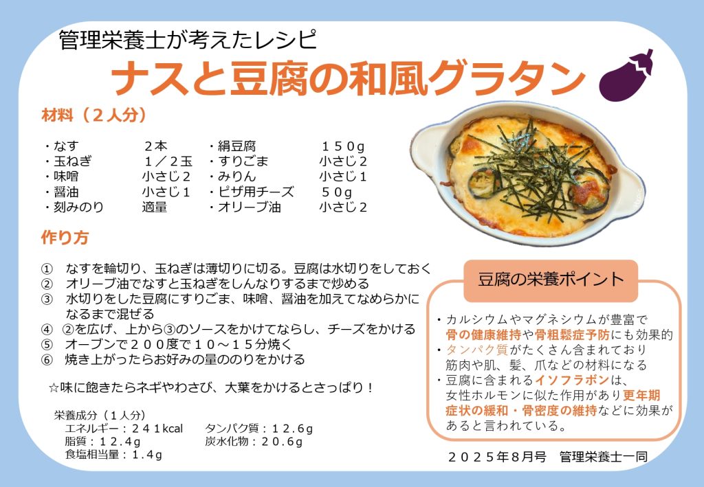 今月のレシピは豆腐のまろやかさとなすのジューシーさが相性抜群「豆腐グラタン」です。