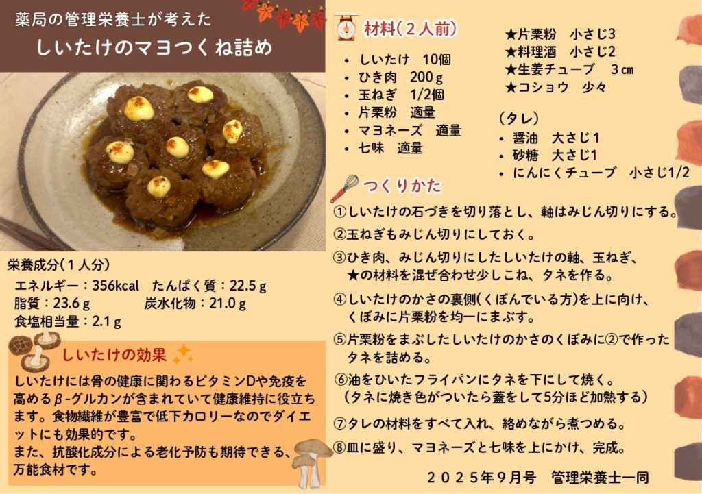 今月のレシピは旬のしいたけを使ったレシピです。