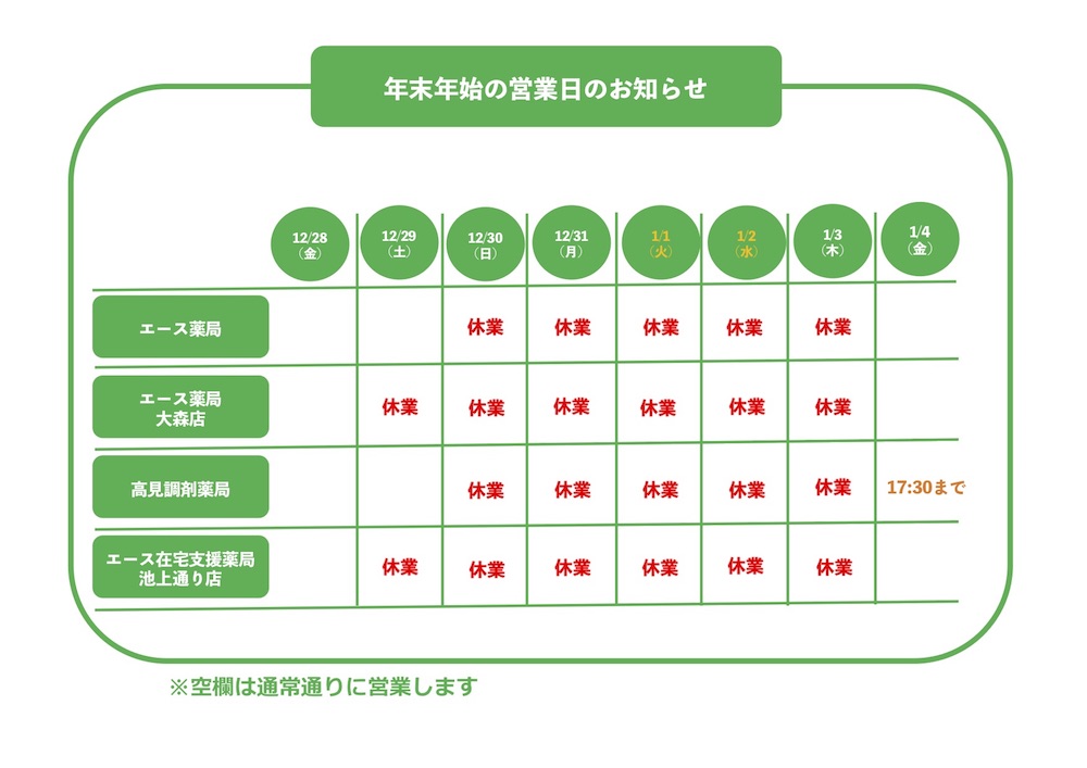 年末年始の営業日のお知らせ